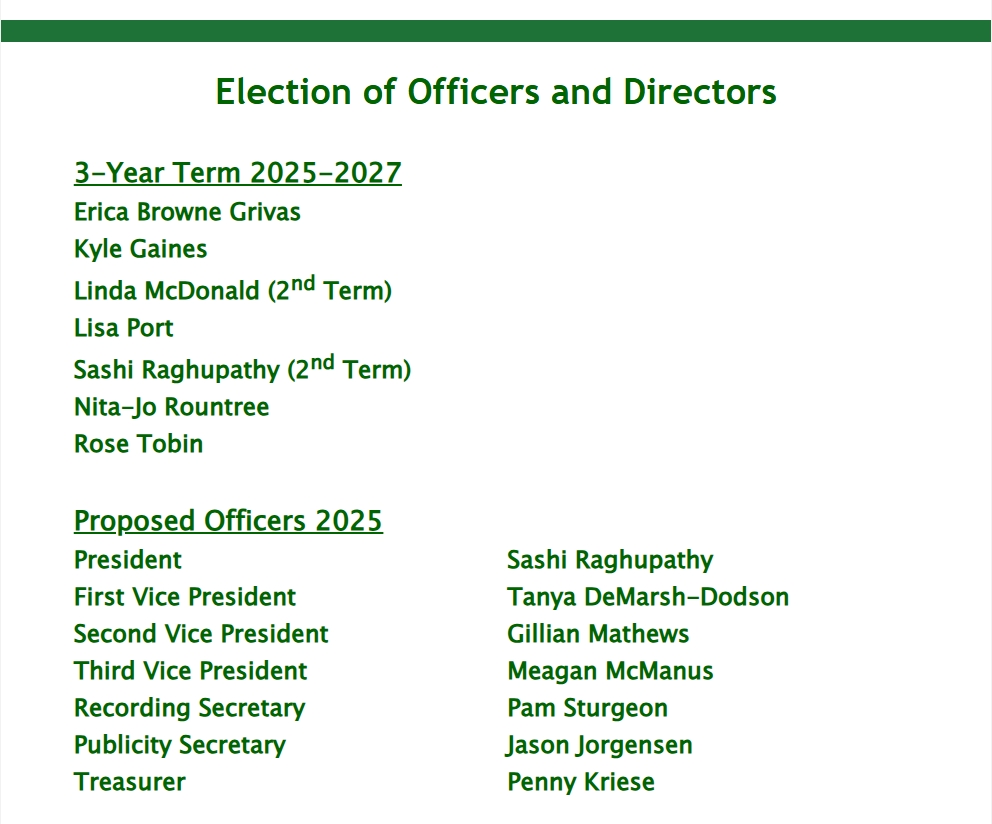 Directors and Officers will be elected at this meeting. In case you are unable to attend in person and are interested in voting, please obtain the fillable PDF ballot using one of the links below, follow the instructions inside, and submit the ballot.