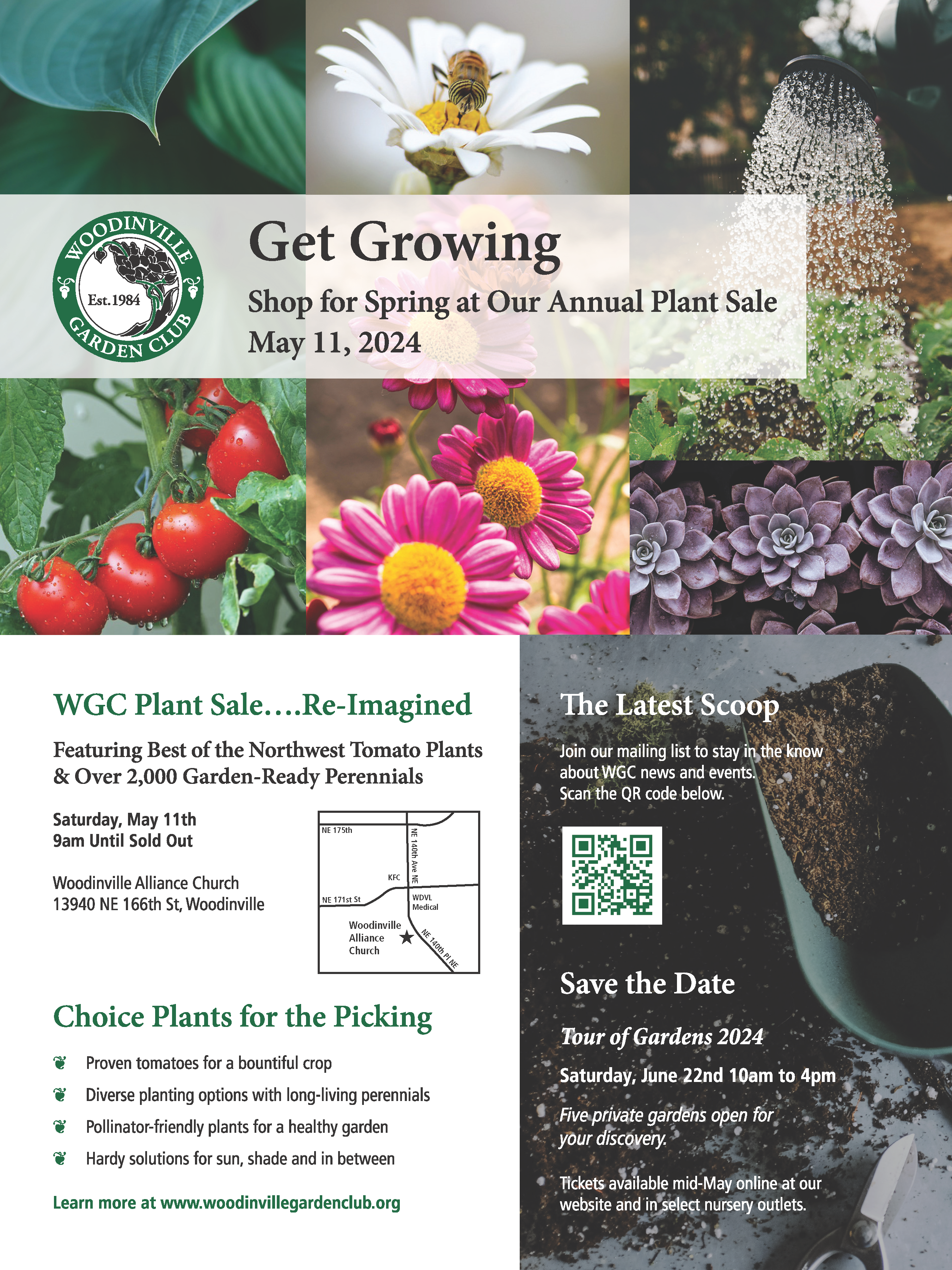 This event is generously sponsored by the Woodinville Garden Club. Please be sure to check out their fabulous upcoming plant sale and garden tour.