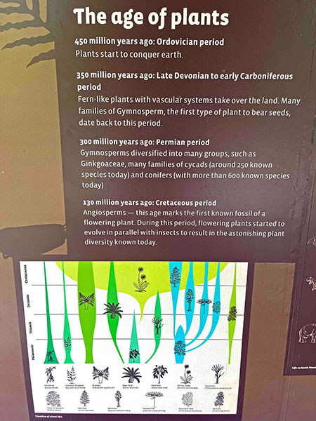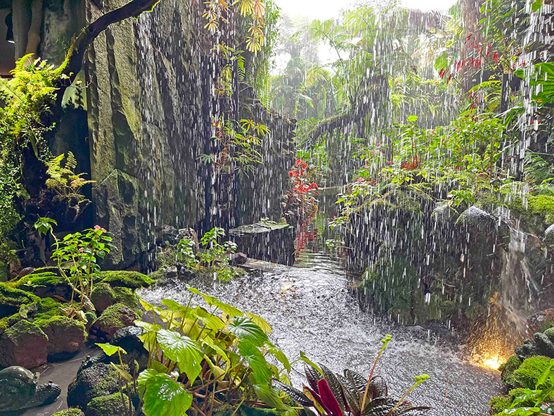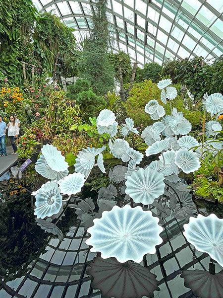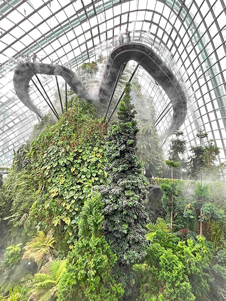 Next door, the notably taller (but with a considerably smaller footprint than its larger Flower Dome sibling) Cloud Forest biome recreates humid tropical montane conditions prevalent at altitudes between 1,000 and 3,000 meters (roughly 3,300 to 10,000 feet) above sea level. An enthralled visitor first faces the refreshing roar and mist generated by a multi-streamed 35-meter (115 feet) waterfall3 before ascending by elevator to the top of conical, 138-foot-tall Cloud Mountain, which is festooned with endless epiphytes: anthuriums, begonias, bromeliads, ferns and orchids. Emerging at top into the Lost World Plateau —which features a Seattle connection in Dale Chihuly’s 2022 sculptural glass ensemble “Ethereal White Persians”— one descends via soaring curvilinear ramps that afford intimate observation of the fabulous flora as well as sweeping vistas of the marina and harbor. The downward slope traverses several more wonder-inducing zones with evocative names: The Cavern, Crystal Mountain, Treetop Walk and Orchid Haven, culminating at the bottom with a watery, stalagmite-studded Secret Garden.