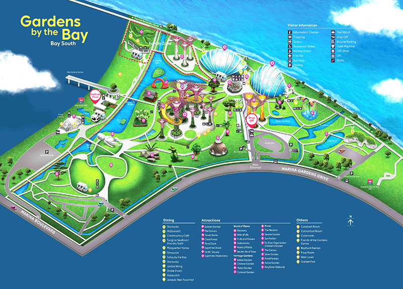The expansive grounds encompass a dizzying number of specialty zones. Among them are the Heritage Gardens (four themed areas representing Singapore’s Chinese, Malay, Indian and Colonial cultures); the Sun Pavilion, an open-air xeriscape collection protected from Singapore’s copious rainfall by a wide glass roof; The Canyon, a ¼-mile-long dragon-shaped trail that winds through the world’s largest collection of sculptural rock formations, which in turn shelter a winning assortment of arid-climate plants; and my personal favorite, World of Plants, which sports six themed gardens that illuminate fruits and flowers, the world of palms, the secret life of trees, the forest understory, the web of life, and a whirlwind history of plant evolution. All of these are open to the public year-round, day and night, with no admission charge.