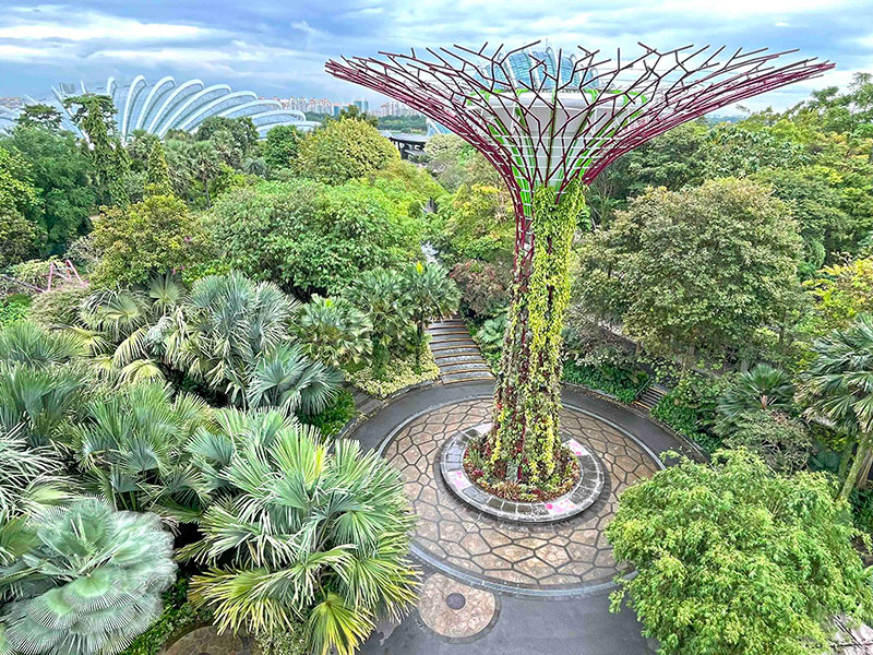 Scarcely 25-years-old, Marina City Park was cocooned in 2007 only to emerge from its chrysalis five years later as GBTB, a comprehensive, over-the-top nature park that exhausted my list of superlatives when I basked in its bounty upon my return to Singapore earlier this year after 35 years of absence. I’m not alone: This year Tripadvisor’s Travelers’ Choice Awards named it #8 among the world’s top attractions, just behind the Louvre in Paris and ahead of the Duomo in Milan. Its eminence emanates from exceptional engineering that embraces these elements: environmental sustainability, ecological education on the essential role of plants, and entertainment of the most salubrious sort for residents and tourists alike. It excels in each of these endeavors. Let’s explore its finest facets: a triad of eclectic exterior gardens, gargantuan glass conservatories and a forest of soaring “Supertrees”.