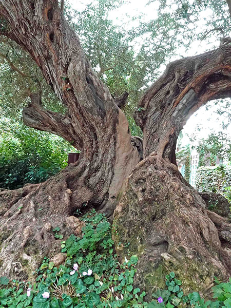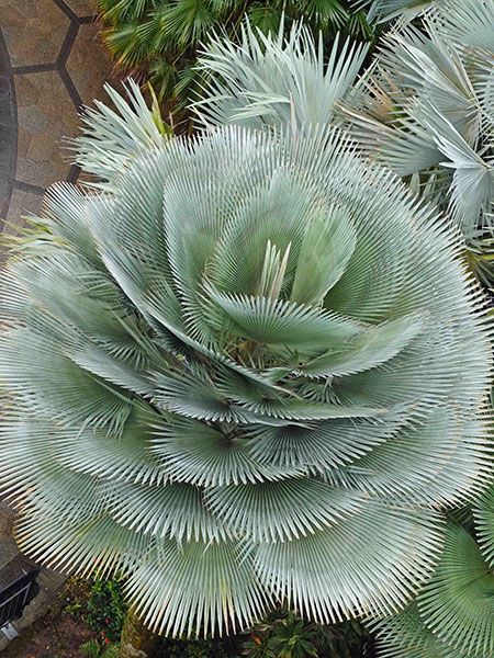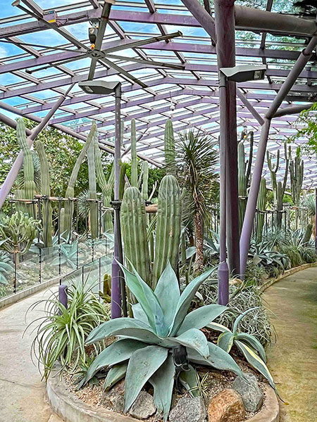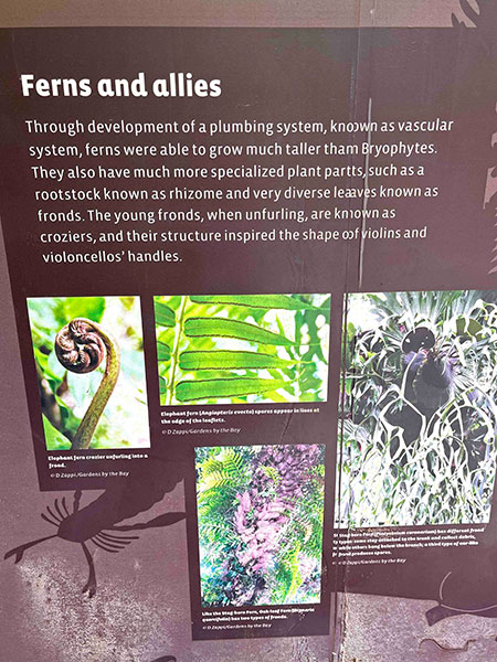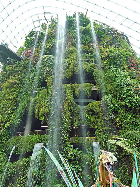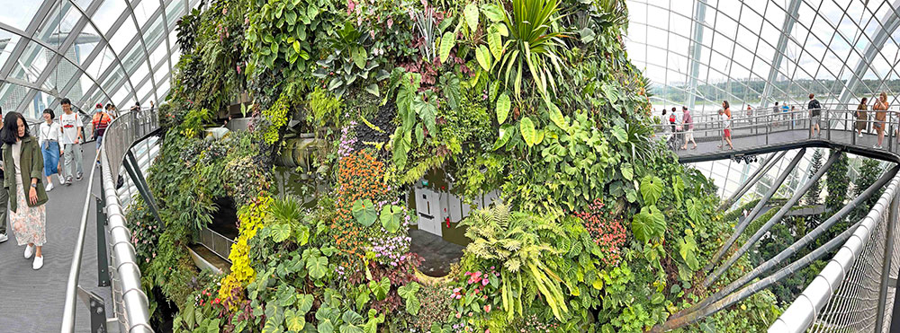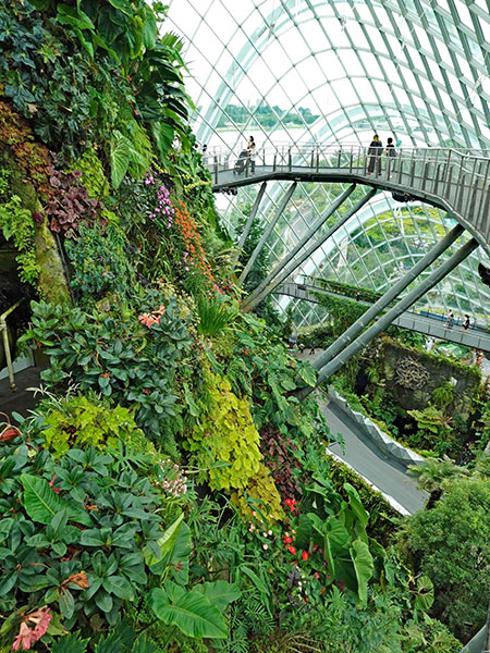 Gleaming sleek and silvery at water’s edge like enormous cyborg armadillos, a pair of massive glasshouses, dubbed Flower Dome and Cloud Forest, seem at once primordial and futuristic. The former (certified in 2015 as the world’s largest glass greenhouse, its column-free interior covering more than three acres) provides cool comfort to succulents of six continents, including a dazzling array of tiny living stones (Lithops species) and other plants that require low humidity. Inside, I ogled in awe at a grove of massive African baobabs and another of multi-centenarian olive trees, marveling at the engineering and artistry as I shuffled through specialty zones that showcase flora of the Mediterranean, South Africa and Madagascar, Australia, South America and California. Of these, only the clumsy, conventional California cluster extracted a “why bother” from me. The others were exquisite.