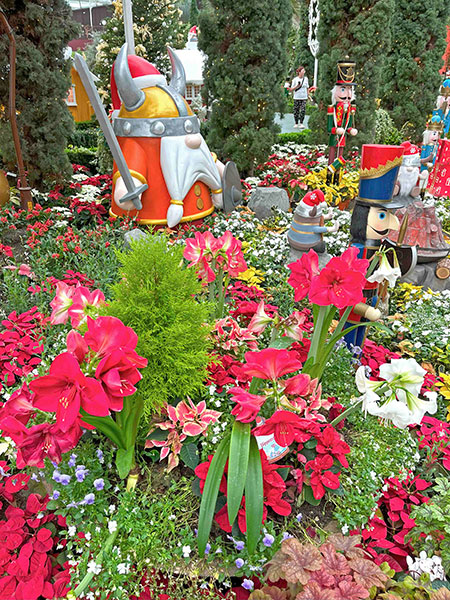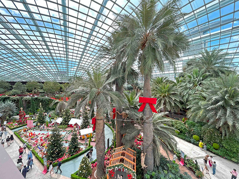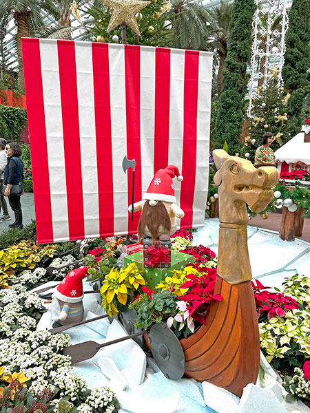 Of greatest interest to hometown (i.e., Singaporean) visitors is the rotating, seasonal Flower Field that holds court in the central floor of the climate-controlled Flower Dome, where swaths of tulips give way to Japanese flowering cherries, which in turn yield to dahlias, and so on as the months progress. During my January visit, a Yuletide-themed Nordic display (cosponsored by embassies of Denmark, Finland, Norway and Sweden) had been extended by popular demand. What could be more exotic in torrid, equatorial Singapore than a poinsettia and amaryllis-studded fishing village of lilliputian Vikings and trolls? The locals couldn’t get enough of it!