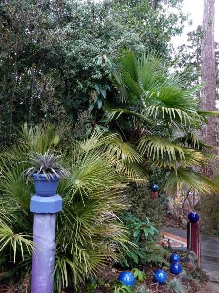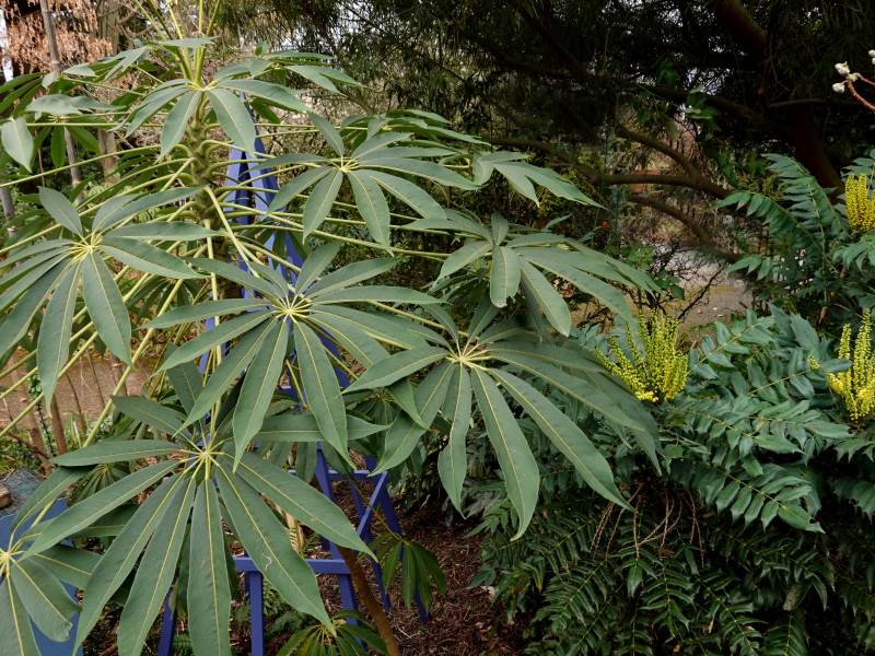 Schefflera and mahonia complement a blue tuteur