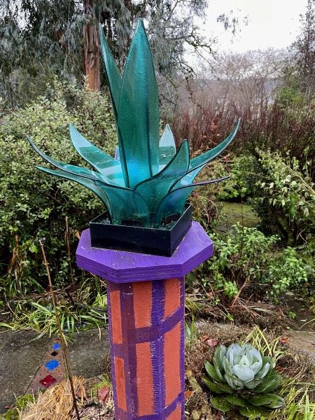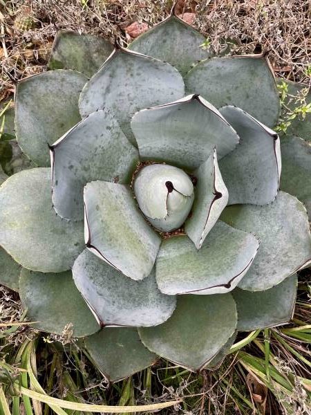 Far to the south, the oceanic antipodes of Australia and New Zealand brim over with blue-gray beauts. In my garden they are represented by the silvery foliage of Eucalyptus neglecta (best coppiced every couple of years, not only to control its aggressiveness but also to perpetuate the rotund, juvenile foliage) and by its towering sibling, E. glaucescens (whose very Latin name means “somewhat bluish-green”). From kiwi-land comes the rock-hardy New Zealand mountain holly, Olearia ilicifolia, whose undulating, coarsely serrated glaucous leaves are assertive but won’t shred the hapless gardener’s hands. We’ll circle back much closer to home with today’s sole non-woody dazzler: the blue-gray rosette formed by Agave parryi var. truncata, sometimes called “artichoke agave”. I grow a lot of agaves, mostly in pots, with a few large ones in the ground, although sheltered by a brick wall and wide eaves. The artichoke agave, along with a couple of pups from the equally hardy A. havardiana are the only ones I grow out in the open with no sort of protection other than sharp drainage.