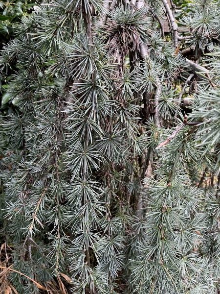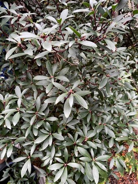 A few of today’s subjects we’ve explored (for their flowers and fruit) in earlier segments of Horticulturally Yours. These include the Mediterranean strawberry tree, Arbutus unedo, whose pink petioles and lustrous leaves brighten even a gloomy January day; the Chilean myrtle, Luma apiculata, whose indigo fruit and glossy leaves persist through winter; and the Tasmanian pepper bush, Tasmannia (formerly Drimys) lanceolata, which combines the pink petioles of Arbutus and the dark fruit of Luma along with deep green foliage that sports a glaucous finish. Click here to see them in “Autumn’s Oddball Edibles”. Another pair of Mediterranean natives worth noting for their bluish foliage include the silvery dwarf, contorted form of Atlas cedar, Cedrus atlantica ‘Glauca Pendula’, and the culinary olive, Olea europea ‘Arbequina’.