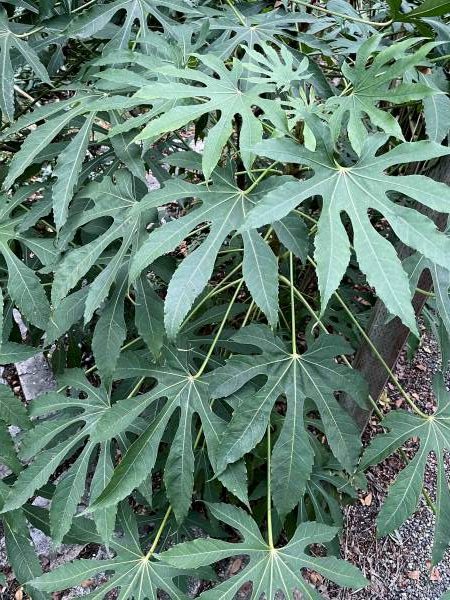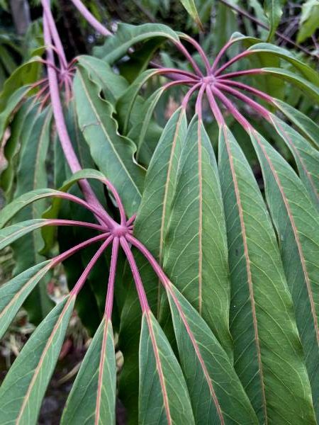 Also of merit are the hardy scheffleras (now reassigned by many taxonomists –although this is likewise disputed– to the genus Heptapleurum). In addition to the large-leaved Schefflera delavayi are the fascinatingly diverse seedlings of S. taiwaniana: one of my clones sports bright pink petioles and veins, while another boasts leaves of deep glaucous green. The closely related genus Fatsia is best known for the reliable, shade-loving F. japonica, but it can’t hold a proverbial candle to the intricate, delicate foliage of its somewhat more tender Taiwan-born cousin, Fatsia polycarpa2.