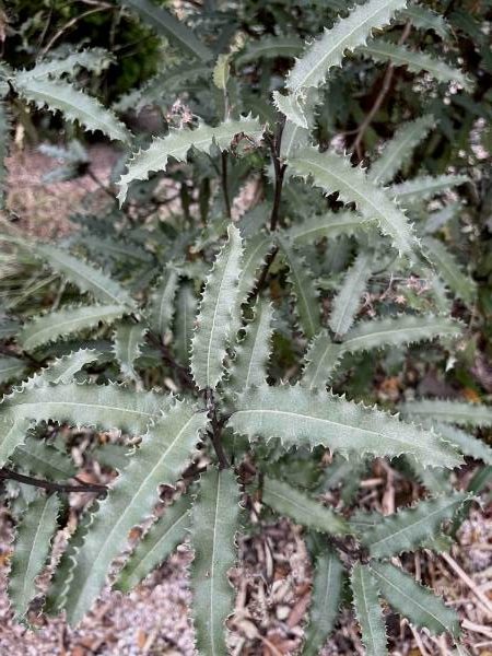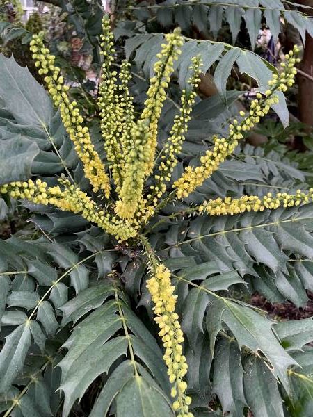 East Asia has graced us with a large coterie of blue-blooded worthies: Although deciduous, the trunk of some selections of Pere David’s maple, Acer davidii, sport snake-bark patterns whose veins nearly pulsate with pewter. It’s the bluish evergreen foliage that stands out in many mahonias (Although the genus Mahonia has been folded into Berberis by some taxonomists, I’ll refer to them here by the “classical” term.) Among my winter favorites are the leatherleaf mahonia, M. bealei, the alluring, diminutive Mahonia gracilipes, whose oblong leaves hide a brilliant, chalky white underside, and one particularly bluish-leaf seedling of the spiny but stately M. × media ‘Charity’, now in full, January bloom.
