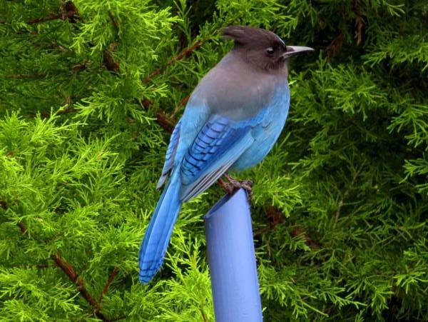 A steller’s jay (Cyanocitta stelleri) surveys the winter garden