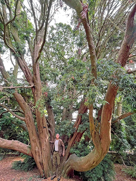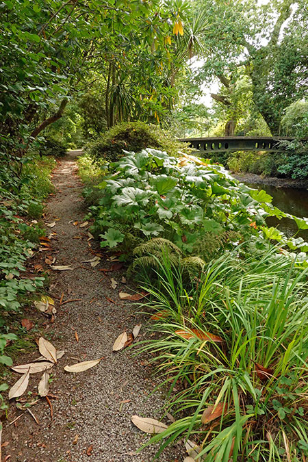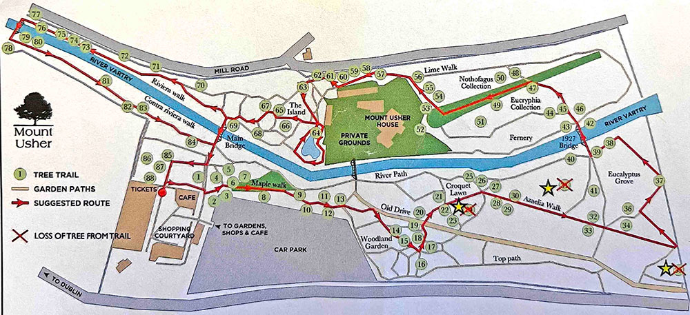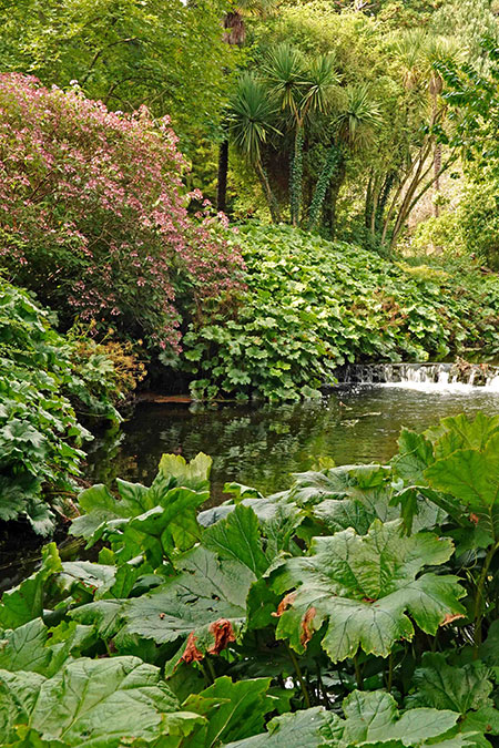 Mount Usher Gardens—In the bucolic County Wicklow village of Ashford, just eight miles north of Kilmacurragh, this storied garden established by the Walpole family in 1868 packs a world into an elongated, 22-acre rectangle bisected by the shallow River Vartry. One of the prime examples of the naturalistic style of gardening promoted by Robinson, Mount Usher was twice voted “Best garden to visit in the Republic of Ireland” by readers of BBC’s Gardeners’ World magazine. A designated Tree Trail (a 1.2-mile loop) highlights 88 towering and magnificent cosmopolitan specimens, many more than 100 years old, lining pathways both broad and narrow that flank the banks of the babbling brook. Sadly, several exemplars were downed by the devastating storms noted above: Storm Darragh felled the garden’s monumental Mexican blue pine (Pinus montezumae), among other titans.