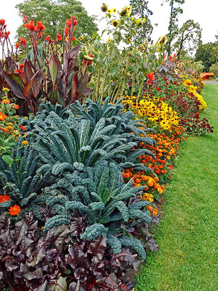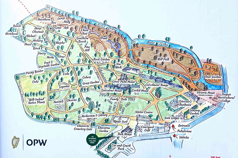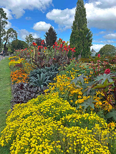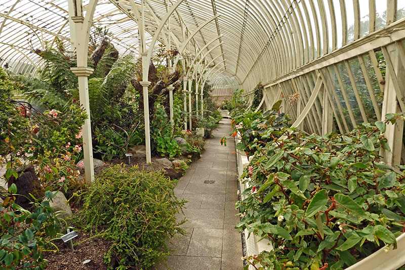 What about the plants? Glasnevin grows 17,000 taxa—including more than 300 endangered species—hailing from all points of the compass. (New varieties of exotic flora have popped up here: Since 2009 I have grown the profusely flowering, South American vining shrub Solanum crispum ‘Glasnevin’.) Taking pride of place at the center of the garden are two sets of fully restored, Victorian-era glasshouses, the majestic Great Palm House, erected in 1884 with a central height of 20 meters (66 ft); and the elegant, one-of-a-kind, cast and wrought-iron Curvilinear Range, finished in 1869 and designed by Dublin’s native son Richard Turner.3 Although the bulk of the campus is a vast arboretum, select beds offer riots of color in seasonal rotation. Not only a feast for the eyes but also for the stomach, they often spotlight ornamental edibles. On the whole, Glasnevin ranks among the most pleasing botanical gardens of the hundreds I have visited on all the inhabited continents of the planet.