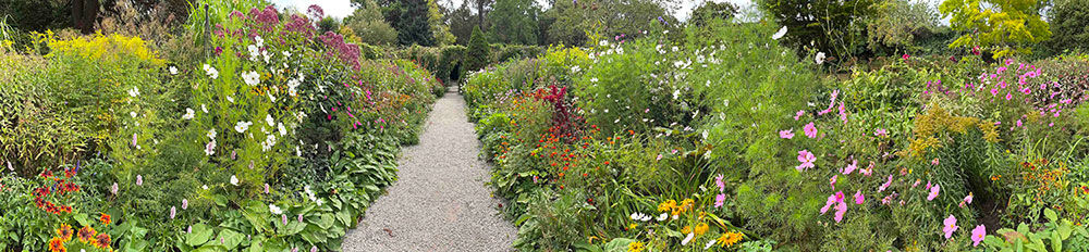 Mount Usher hosts the Irish National Collections of Eucryphia and Nothofagus, so I was saddened to see that destruction also befell several of their champions. Among the motivators for my visit was the wish to pay respects to one of the most prized plants in my own garden, Eucryphia × nymansensis ‘Mount Usher’, which debuted here in 1927. Alas, I could not find any remaining specimens of it. Much of the vaunted eucryphia section was in disarray wrought by the wicked winds, although I was relieved to find the record-holding, 85-year-old E. moorei still in fine fettle. At the end of my brief sojourn here I took solace in the voluptuous exuberance of the double herbaceous borders brimming over with cosmos and eupatorium, rudbeckia and solidago, all shimmering softly in the caress of a late-August breeze.