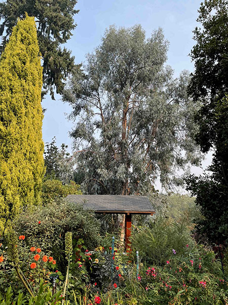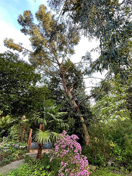Are you wondering about the fate of the two gigantic gums that remained in my garden after the 2019 purge mentioned above? Husband insisted we needed to remove both. He almost certainly had the better argument, but graciously agreed to a compromise. In April 2022 we engaged the same seasoned arborists to excise the ravenous E. archeri that not only loomed ever closer to the neighbors’ house but also engulfed a mature and much more appropriate Laurus nobilis (bay laurel) that is now breathing a massive sigh of relief. Our garden now sports a sole survivor: the drop-dead gorgeous but somewhat chastened 80-foot E. glaucescens, even though it has twice mangled nearby sprinkler pipes and continues to impoverish now anemic garden beds 50 feet or more from its base.