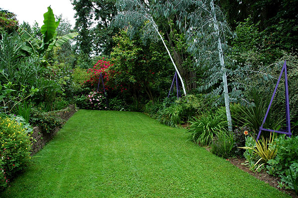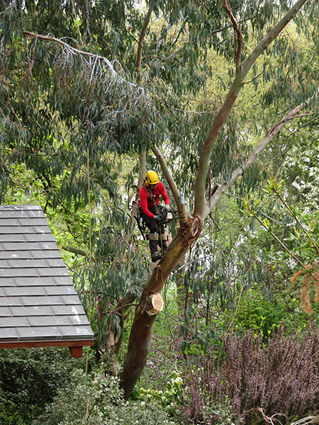 By 2012 a quarrelsome quartet of titans remained: E. neglecta, or “omeo gum,” which devoured ever greater chunks of our front garden; E. perriniana, or “spinning gum,” which insisted on growing at a precarious and terrifying 45-degree angle; E. archeri, or “alpine cider gum,” whose handsome and husky limbs grew like Medusa-head pythons that threatened the neighbors’ house; and E. glaucescens, the regal but rambunctious, ramrod-straight “tingiringi gum”2 that ruled the roost at the eastern border of our garden near the edge of a wooded slope. Something had to yield. In April 2019 my long-suffering husband convinced me to call in the big guns, a crew of arborists who removed the first pair noted above along with reining in and cleaning up rogue portions of the latter two.