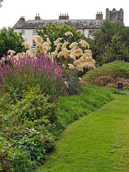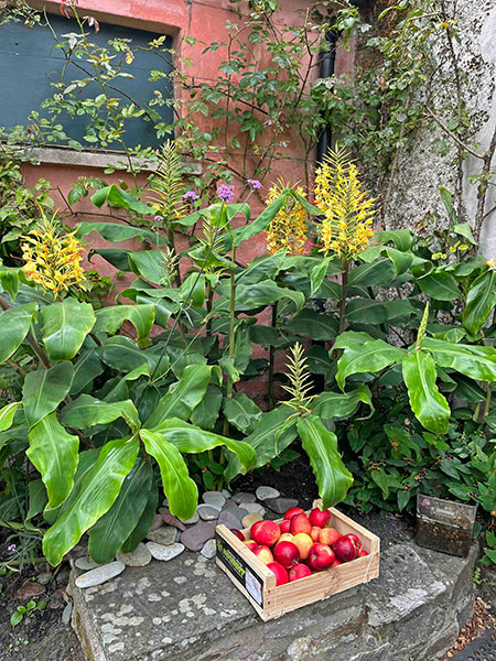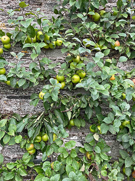 Germane to today’s topic, the abundant delectables served in the historic house’s seven dining rooms are largely harvested on the premises or sourced locally. (The house’s original, sapphire-blue dining room is –fittingly– dubbed the Yeats Room.) An enormous walled garden near the house shelters more than an acre of fruits and veggies of all persuasions, nestled and swaddled among hirsute and handsome, edible-adjacent trees, shrubs and assorted ornamentals. As we saw in many Irish gardens, southern hemisphere woody plants flourish here: Robust, mature specimens of acacia and crinodendron, luma and pittosporum abound. On the walled garden’s eastern flank is a newish (planted in 2014) two-acre apple orchard that produces juice and a dry, hard cider of renown made from several heritage varieties, including Crimson Bramley, Dabinett, Santana, and Topaz.