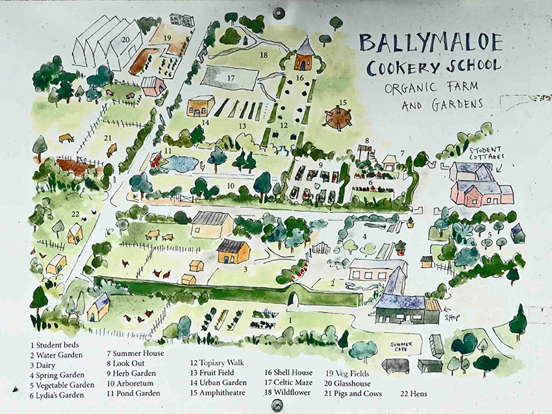 Around two miles from the main house is the culinary mecca of Ballymaloe Cookery School (Ireland’s finest, opened in 1983 by Myrtle Allen’s daughter-in-law, the author and celebrity chef Darina Allen), which sports a vast organic farm on its 100-acre plot. Greenhouses cover a full acre of space. An enormous state-of-the-art glasshouse structure meant to replace the original trio was nearing completion during my visit. Casual visitors and cookery students alike revel in the adjacent gardens that feature more than 20 themed areas including an arboretum, an herbaceous border, wildflower meadow, cottage garden, pond garden, Celtic maze, topiary walk, urban food garden and an elaborate, formal herb garden.