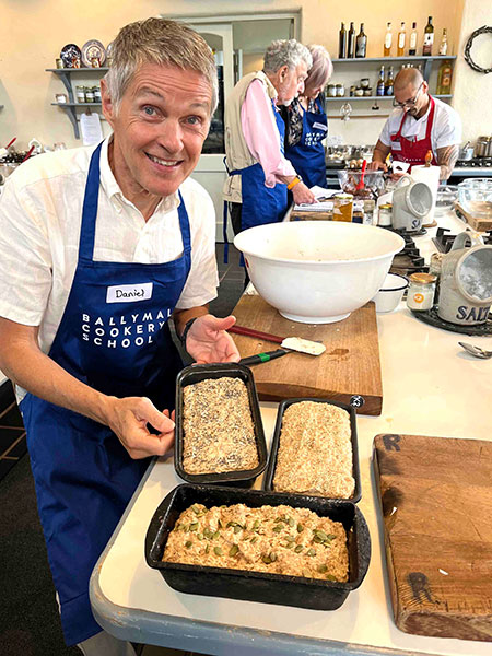 Susan, the birthday girl who was our reason-for-being at Ballymaloe, arranged an intensive afternoon of culinary instruction for our group of 20. After marveling at the wonders of the organic farm and absorbing an hour-long classroom demonstration of technique, it was all-hands-on-deck (and in the mixing bowls) as we divided into a trio of teams to prepare and share a fabulous, multicourse feast for dinner. My plant-based group, under the expert tutelage of Chef Francesco, confected a cornucopia of gustatory delights: seed-strewn whole-grain breads, a savory red-lentil dal, aromatic basmati rice, crunchy papadums, and a lavish, Italian-style fresh-fruit salad. Voilà! Behold the results: