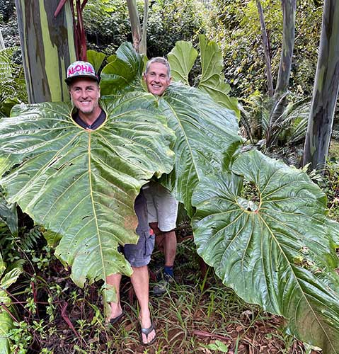 Five years ago renowned gardeners Dan Corson 2 and Berndt Stugger—widely celebrated in the Pacific Northwest for their award-winning, “primordial” Jurassic-themed urban wonderland—pulled up stakes in Seattle to plant themselves permanently in Papaikou on the ruggedly beautiful Hāmākua Coast north of Hilo on the Big Island of Hawaiʻi. “We came for the lush landscape and to be able to [nurture] the tropicals that we lusted to grow without having to wrap or lift,” Dan recounted to me in a recent conversation. Their definitive move came after a decade of preparation, having purchased in 2006 a 6.5-acre plot of fertile, sloping agricultural land that for decades had been devoted to the monoculture of sugarcane.