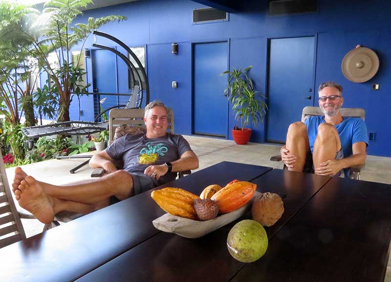 Their original intent to establish a tropical botanical garden of edible as well as ornamental plants took a slight course correction when they learned the land was optimal for cultivation of Theobroma cacao. Within a few years and despite a couple of disheartening setbacks 3, their 650 trees were producing pods in abundance, and Dan and Berndt launched the Hāmākua Chocolate Farm to charm residents and travelers alike as well as enhance their agricultural literacy. The chocolate treats they now confect are complemented by a panoply of botanical edibles incorporating flowers, leaves, nuts, seeds, fruit and essential oils that they grow and produce on site.