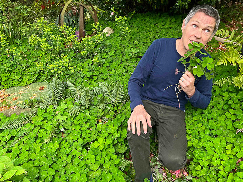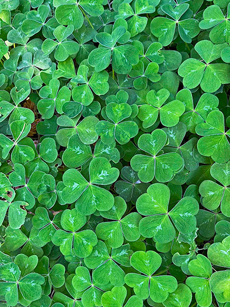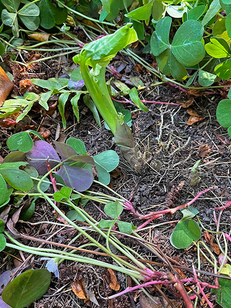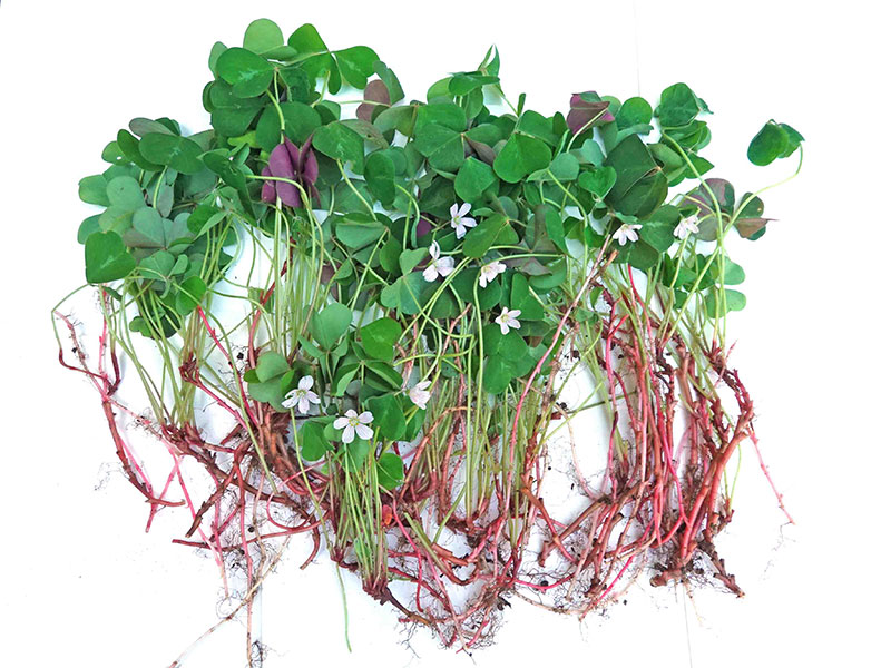 Oxalis oregana, commonly called redwood sorrel, differs from its fellow baddies in that it’s a PNW native plant, found in moist areas from the central California coast to British Columbia, but mostly in western Oregon and Washington. Its cloverlike leaves, which have a pleasantly tangy taste, were on the menu of the Cowlitz, Quileute and Quinault peoples, although they’re potentially harmful if eaten in quantity due to their high oxalic acid content. The lush foliage, propelled by a prodigious network of scaly pink rhizomes, forms a dense carpet, which looks lovely until it forces its way into beds of delicate ornamental woodland treasures such as Hepatica, Hosta, Paris, Trillium and small ferns, and proceeds to strangle them.