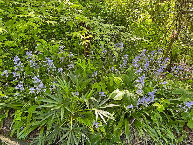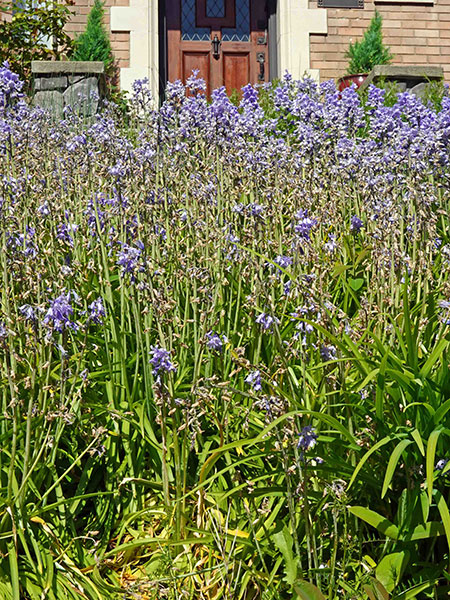 Hyacinthoides hispanica4 invaded my neighborhood from who-knows-where several years ago and now occupies large swaths of real estate all over town. Often called Spanish bluebell (although flowers may also be lavender, pink or white), this plant is pretty for a few days but turns decidedly shabby past its peak. A major bully, it claims more and more space via seeds, rhizomes and proliferation of white, spherical bulbs, which after a few years may cluster in the dozens to form a mass nearly as large as a soccer ball. Declared invasive in the UK, it’s increasingly seen as such in western Washington and Oregon. According to WSU Clark County Extension, “This plant should be used with caution as it can take over a landscape. Dig it out by the roots. […] All parts of this plant are poisonous.” Nuff said? Puzzling that many of this country’s most prominent purveyors of bulbs still market it in glowing terms.