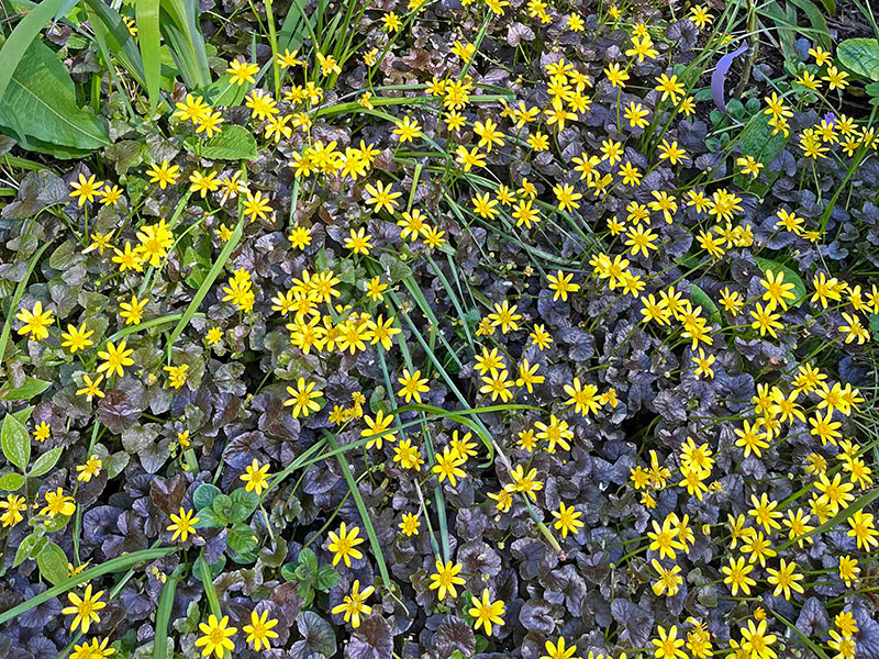 Ficaria verna (still called by its former name, Ranunculus ficaria, by many gardeners), has two common monikers: fig buttercup and the posh-sounding “lesser celandine”. In fact, the brash bronze-leaved version I bought at Heronswood in 1996 has an illustrious pedigree, having been dubbed ‘Brazen Hussy’ and introduced to cultivation by the exalted Christopher Lloyd. At first thought to be sterile, or nearly so, it has proven to be as profligate as its cultivar name suggests. Last month I spent dozens of hours grubbing out hundreds of the glitzy-glossy tuberous clumps that have infested half a dozen zones in my garden. Without doubt, it will be back next spring: Controlling it is a multiyear project.