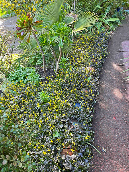 Some sources state this oxalis is easy to control. Ha! I purchased and planted a couple of 4-inch pots in 1994. About five years later I recoiled in alarm as it began to run roughshod over ever larger swaths of landscape. Alas, eradication has proven nearly impossible due to the dastardly rhizomes’ friability (a Darwinian triumph, I suppose): Elusive strands that break off and lurk in the soil after my futile attempts to grub them all out succeed in regenerating the mass within a couple of years, whereupon it resumes its green tsunami of doom and the cycle continues.