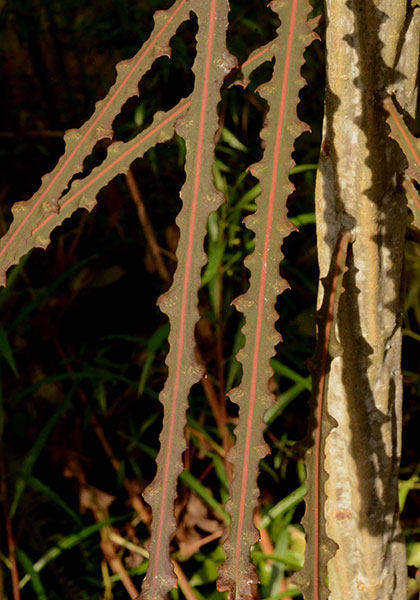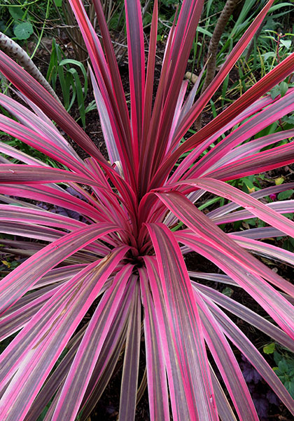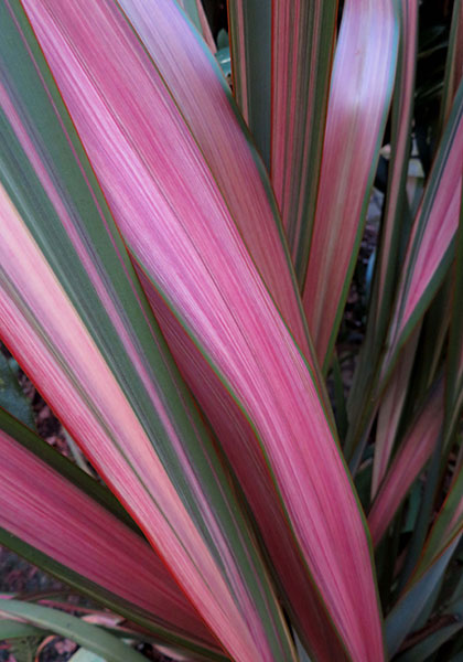 For our finale, we’ll focus on the vivid foliage of three nearly hardy Kiwis: Cordyline australis ‘Cherry Sensation’ (its cultivar name spot-on accurate), usually confined to a container even though I’ve grown mine in the ground for five years, Phormium ‘Jester’ (aka ‘Emerald Pink’), a compact and lovely flax whose rosy striations have proven pleasingly stable in not reverting to all-green in the 11 years I’ve grown it, and to wrap up, the outlandishly weird Pseudopanax ferox, which sports a pink racing stripe down the middle of each rigid, 14-inch-long by ½-inch wide sawblade leaf. Pseudopanax fans, take note: This bizarre genus is the topic of a future Horticulturally Yours segment, coming in early 2022.