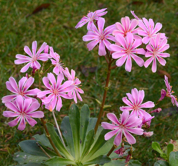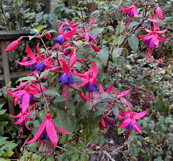 The hardiest of today’s bunch is also the most local, Lewisia cotyledon, hailing from rocky slopes of the Siskiyous in southern Oregon and northern California. The ‘Elise’ strain is a reliable repeat bloomer. In order to savor its diminutive favors, I keep it in a shallow, scree-filled tray on a window ledge near the kitchen door. Two hardy fuchsias are also in the spotlight now: the vibrant and compact ‘Eden Rock’ and the more demure (in terms of color) but irrepressible ‘Surprise’ (aka ‘Pat’s Dream’), which for me is usually in bloom nine months a year.