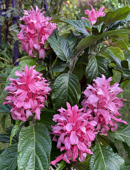 The prize for greatest revelation of 2021 —in the ugly-duckling-to-swan category— goes to Justicia carnea, the flamboyant Brazilian-plume or jacobinia, which I subjected to malign neglect (if not outright torture) in a container for nine years until a moment of reckoning came after the June heat dome. In a quandary over whether to toss its bedraggled, skeletal body into the compost bin, I opted instead to lop its frame back to 4-inch stubs and repot it in fresh soil. One lunar cycle later it burst forth with luscious and lustrous ovate leaves, followed in November by architecturally distinctive flushes of flamingo inflorescences at the tips of six branches. Duly chastened, henceforth I’ll keep it well watered and adequately nourished.