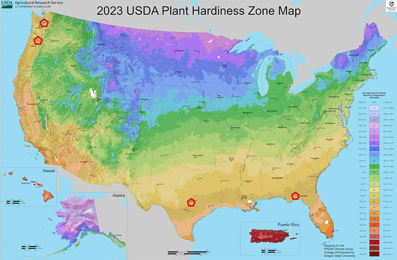 First, a bit of background: The USDA’s initial plant hardiness map, issued in 1960, divided the continental U.S. into 10 climate zones based on average annual extreme minimum winter temperatures, in 10-degree increments from 30o Fahrenheit in Zone 10 (coastal California & south Florida) down to minus 60o in Zone 1 (interior Alaska). A revision in 1990 brought in Hawaii, adding an 11th zone for tropical areas. The 2012 version added uber-tropical Zones 12 and 13, and further divided all zones into “a” and “b” categories with finer, 5-degree increments. Since then, according to the USDA’s new 2023 interactive map, the average temperature in much of the immediate Seattle area has risen enough to lift us from Zone 8b to 9a, indicating an average extreme yearly low of 20o to 25oF. (Ironic, isn’t it, that January 2024 registered four consecutive daily lows of 16o, 14o, 14o and 18o at Seattle’s Boeing Field?)