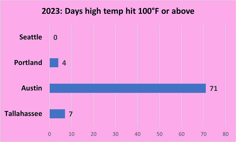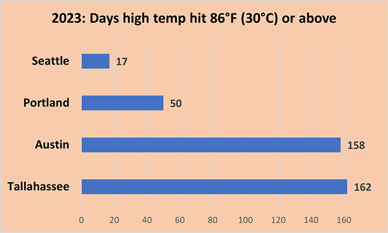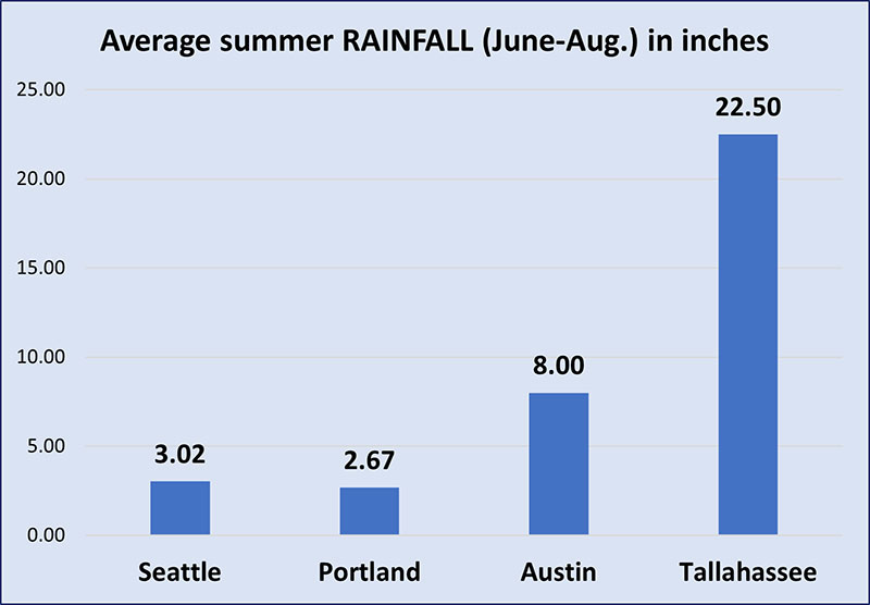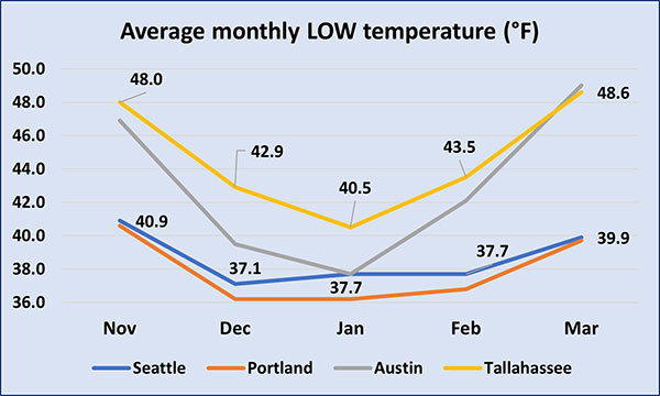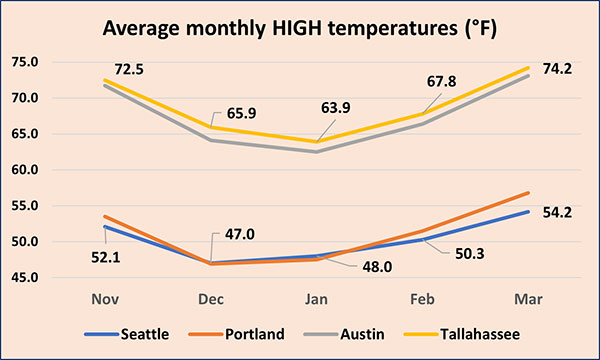 A Tale of Four Cities: Among the fellow travelers promoted to 9a are the capitals of the country’s second and third most populous states, Austin, TX and Tallahassee, FL. Closer to home, our beloved cousin, Portland, is split down the middle, with the town’s eastern half now in 9a while the western portions remain in 8b. Here some uncomfortable truths emerge. Cool-summer Seattle cohabits zones with our warmer-summer neighbor, Portland. Granted, these two share essential similarities of dry summers and wet winters. But what about such fundamentally alien areas —climatically speaking— as Austin and Tallahassee, with their sweltering, sopping summers and mild winters only occasionally subjected to freezing fronts that barrel down from Canada. As the accompanying charts attest, although average winter lows, at least in January, are sort of similar in the four cities, daily winter high temperatures in the southern pair eclipse those of Seattle and Portland by around 20 degrees.