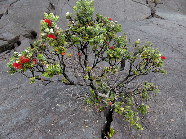 It’s hard to overstate the ecological importance of the emblematic ‘ōhi’a, which is endemic to Hawai’i, occurring naturally nowhere else. By far the state’s most abundant native tree, ‘ōhi’a old-growth forests are vital in protecting watersheds and providing habitat –both food and nesting sites– for several endangered avian and invertebrate species. Growing from sea level up to 8,000 feet, Metrosideros polymorpha thrives in bogs, rain forests, arid shrublands, lava fields and windswept slopes alike. In form, it takes on shapes as diverse as prostrate natural bonsai to towering 100-foot behemoths. Although most commonly cardinal-red in color, blossoms on other varieties of M. polymorpha (eight are recognized) may be cream, yellow, orange or pink in hue.3
