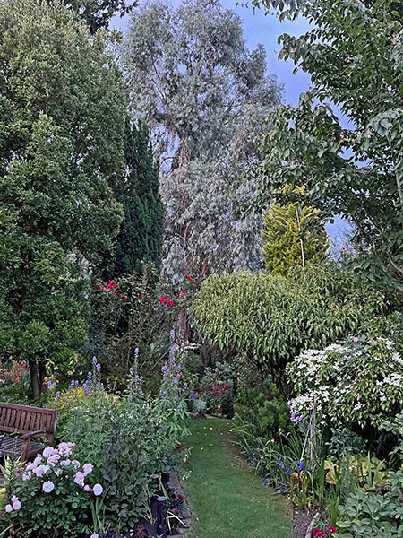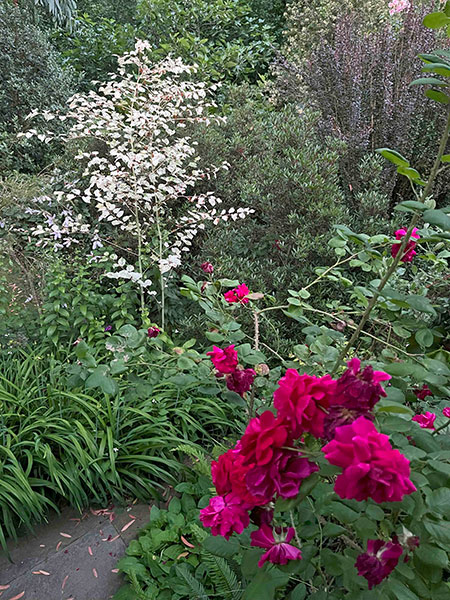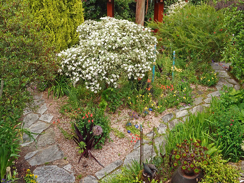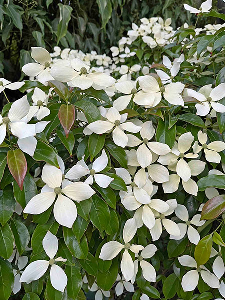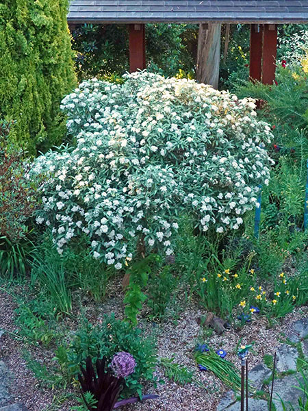 C. At the apex is a strapping cohort of stately and steely shrubs (plus a tree and a perennial) that entice admirers to look up. We begin with the titan, a towering, awe-inspiring and fear-inducing 26-year-old Eucalyptus glaucescens that looms both protectively and threateningly over the lower half of my garden, followed by one of the most elegant of all dogwoods, the mostly evergreen, June-blooming Cornus elliptica ‘Elsbry’ (aka ‘Empress of China’). Next are a pair of New Zealand natives: Pittosporum tenuifolium ‘Irene Paterson’ (sources cite its mature height as 4-6 feet, but my 23-year-old approaches 20 feet) and the so-called mountain holly, Olearia ilicifolia, a gorgeous shrub whose mounded canopy is smothered in tiny white daisies in early June.