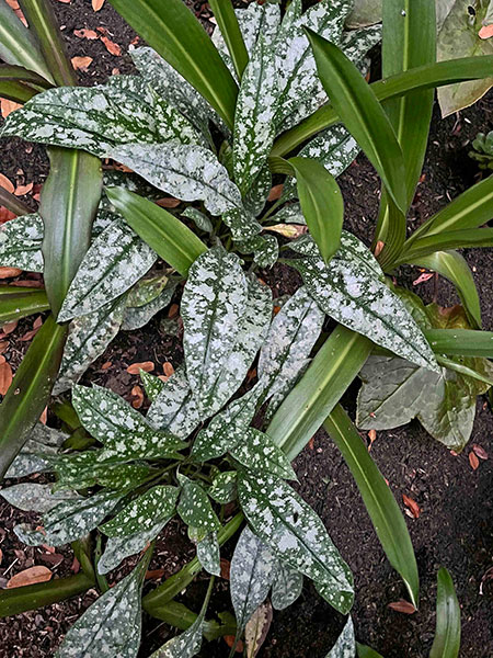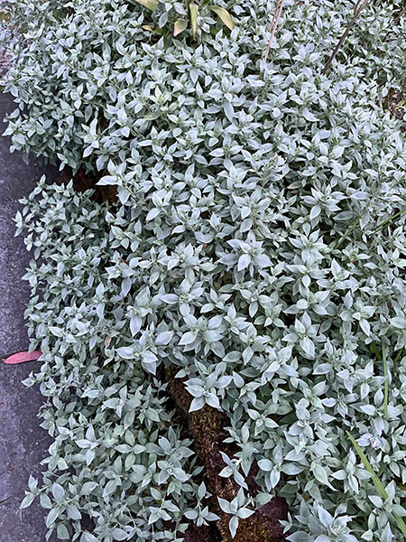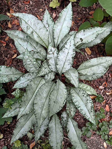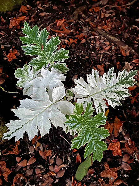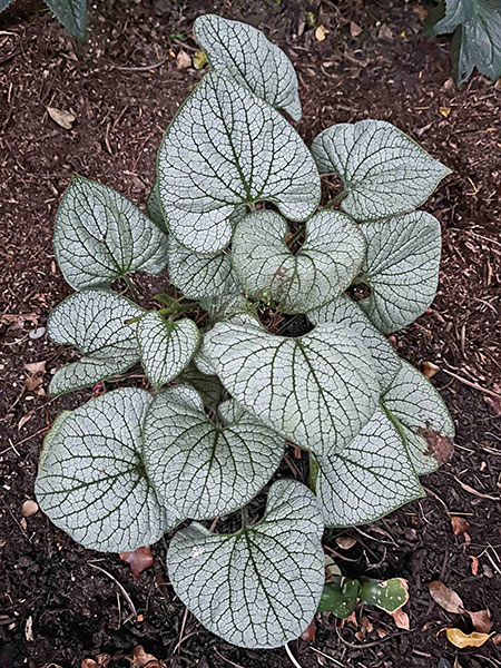 A. Let’s begin with an octet of ground-hugging perennials, mostly shade lovers. Acanthus mollis ‘Tasmanian Angel’, much slower-growing and better behaved than the straight species, sports new leaves that shine like a floodlight. Brunnera macrophylla ‘Silver Heart’ (PP #24,685) is totally true to its name, right down to the leaves’ prominent veins. The silver ribbon fern, Pteris parkeri, requires a little protection (I insulate my 10-year-old clumps with a blanket of maple leaves and throw a couple of layers of burlap on top during severe cold snaps), but its prolific neighbor, Saxifraga stolonifera, merrily waltzes through winter.