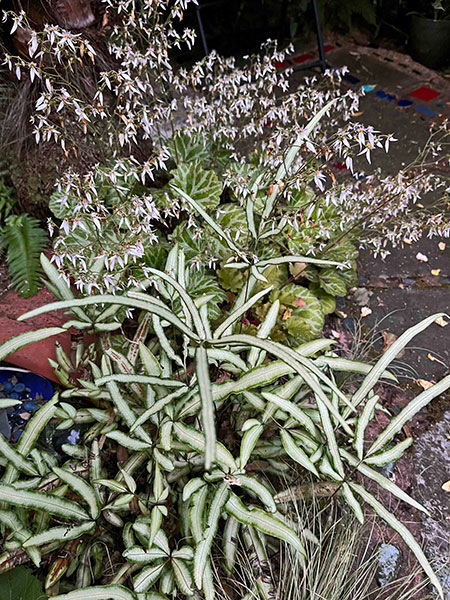 In previous segments of Horticulturally Yours we’ve pranced through patches of pink, blue, yellow and orange plants. Isn’t it proper to consider now the paler portions of the chromatic (and achromatic) visual experience in the twilight hour? Since the beginning of June, I’ve embarked on a “magical mystery tour”5 of my own garden in the waning, post-sunset glimmer, slowly shuffling along pathways aglow with the silky sheen of alabaster alstroemerias and effulgent euphorbias, ivory olearias and frosted fatsias, pewtery pulmonarias and powdery persicarias. Especially this year, I’ve found this practice not only restful, but also profoundly restorative. With only the pair of exceptions noted, every photograph in this posting was taken over the last few days at dusk, between 9:00 and 9:45 p.m., the time one can “breathe deep the gathering gloom, watch lights fade from every room,” as sung in the “Late Lament” section of “Nights in White Satin”. Of the 24 taxa discussed and portrayed here (arranged by plant height in groups labeled A, B and C), only the agave and orchid cactus are frost sensitive and grown in pots; the others have proven hardy in the ground for me.
