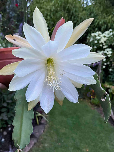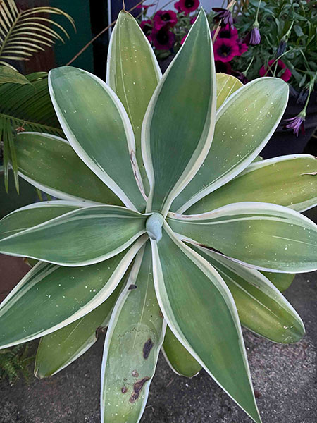 What is a shade garden without lungworts? My picks for a moonlit stroll are a pair of hybrids of Pulmonaria longifolia: ‘Diana Clare’ and ‘Trevi Fountain’. A low-growing trio that requires sunlight includes Epilobium septentrionale ‘Select Mattole’ (aka California fuchsia), whose profuse blooms arrive in August atop its graceful, glaucous foliage; the docile, soft as silk and aptly named Agave attenuata ‘Ray of Light’ (PP #21,854); and an epiphytic orchid cactus that produces creamy blooms up to 9” wide. The latter pair need to overwinter under cover.