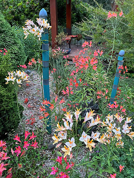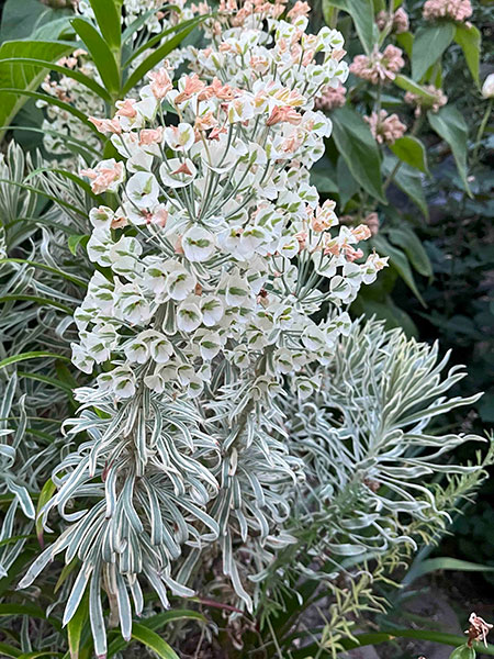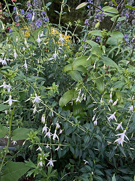 Apropos white, is it a color or not? Most people treat it as one3 even though it isn’t on the visual chromatic spectrum. More refined and sophisticated gardeners than Yours Truly liberally endorse and employ white flowers and foliage, extoling their values of nuance and subtlety. I am of two minds regarding its virtues. While white can connote innocence and purity, it’s also a universal symbol of surrender. Wan, washed out, drab, ghostly, lifeless: It seems fitting that white is associated with mourning in many cultures. Eminent plantsman and all-around good-guy-cum-garden-guru Duane West doesn’t cotton at all to the white garden camp. “Looking at white flowers is like staring at a light bulb,” he opines. I mostly agree with that assessment during daylight hours, especially when the sun is out, but dusk delivers a natural rheostat that dials down diurnal dazzle to a soothing nocturnal simmer.