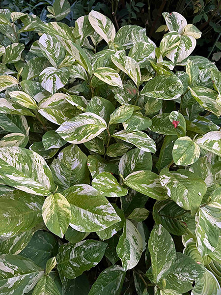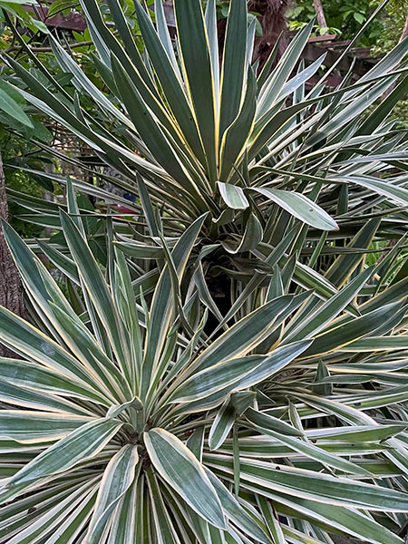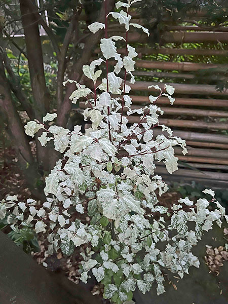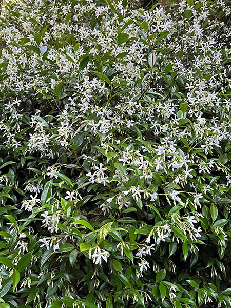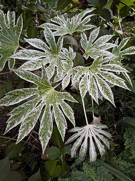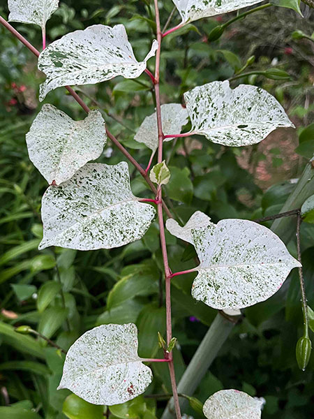 Queen of the night right now is star jasmine, the evergreen woody liana Trachelospermum jasminoides that perfumes summer evenings for weeks. Close by is her bodyguard, a sprawling, handsome and well-armed Yucca gloriosa ‘Tricolor’. Wrapping it up is the oddest ball of all, Reynoutria japonica ‘Variegata’ (formerly classified as Fallopia or Polygonum), a weird and wonderful mutant of Japanese knotweed with none of the nasty traits of the straight species, which is condemned as one of the “worst invasive species on the planet”. A winter-dormant perennial, my 33-year-old specimen sends up only two or three 9-foot canes a year, never having budged from its original spot.