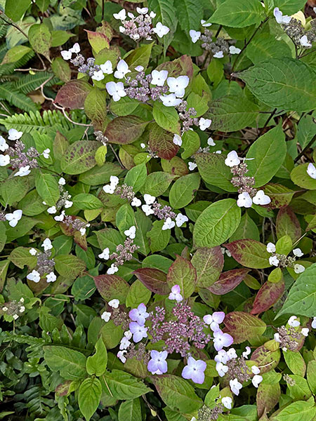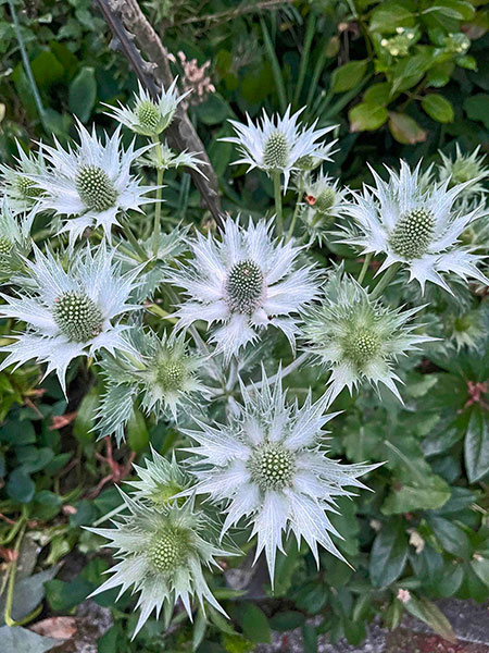 Completing the octagon are Hydrangea serrata ‘Beni-gaku’, a compact cutie that shifts color over several weeks; followed by the reliable and adaptable North American native Persicaria virginiana ‘Variegata’; then a healthy, remontant and fragrant old German floribunda, Rosa ‘Gruss an Aachen’; and finally the prickly, profligate and persuasive Eryngium giganteum, aka Miss Willmott’s ghost.