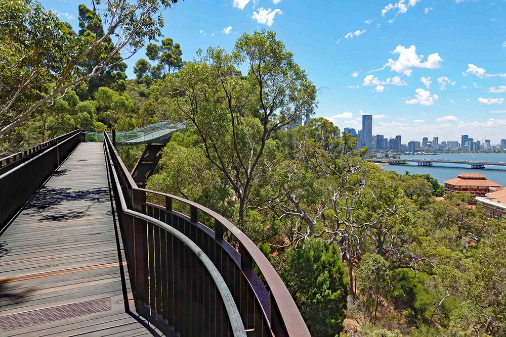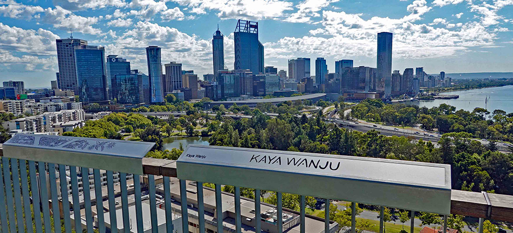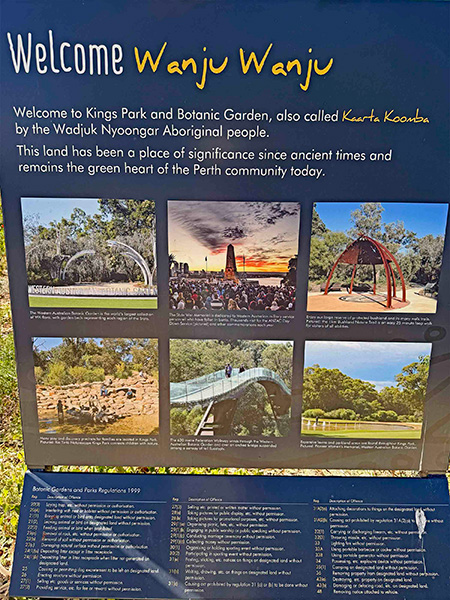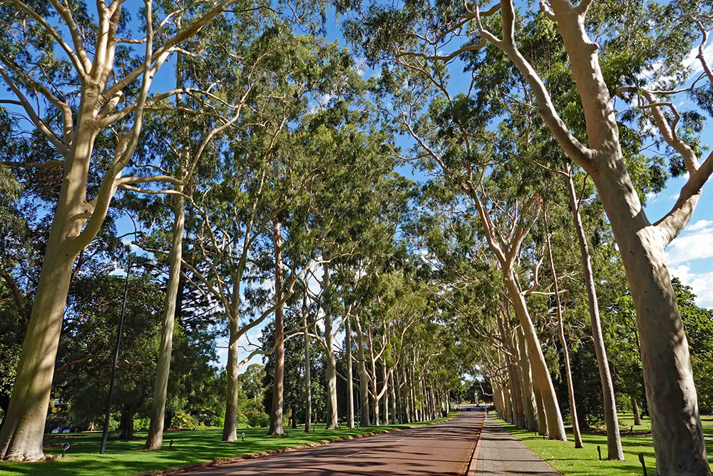 Perth (unlike Sydney and Melbourne, but similar to Seattle) has a Mediterranean climate with wet winters and dry summers. The relatively well-watered southwest corner of the sprawling state of Western Australia is an official global biodiversity hotspot, with around half of Australia’s 25,000 plant species endemic to this small sliver of the continent. More than 3000 of these (including the Eucalyptus macrocarpa described here) have a home in the 44-acre splendor of the Western Australian Botanic Garden, perched on Mount Eliza and overlooking both the city center and a wide, graceful bend of the Swan River. The garden is nestled within the 1000-acre Kings Park—one of the world’s largest inner-city parks and an important heritage site for the aboriginal Noongar people, whose culture is consulted and evoked at many points and places in the garden.