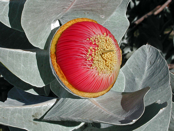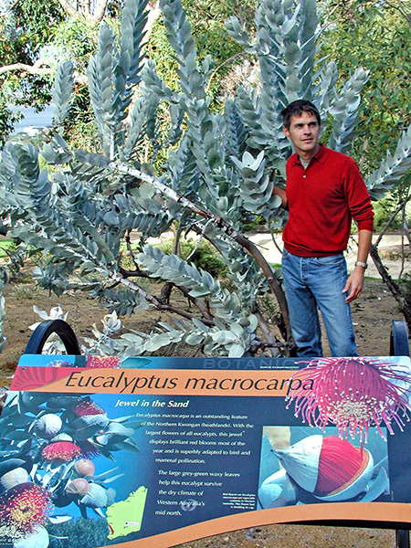 On my first visit to Western Australia 22 years ago I was eager to ogle new and distinctive species of acacia, banksia, grevillea, eucalyptus and other antipodal treasures after having met their east-coast cousins in Sydney, Canberra and Melbourne on previous forays Down Under. So although addled by the arduous steps required to get to Perth, on my first full day, a deliciously cool, overcast morning in late winter, I made a beeline for regal Kings Park and its spectacular array of native plants. Of all the weird and wonderful botanical jewels I encountered there, none captured my attention more than Eucalyptus macrocarpa2, a short shrub curiously cloaked with surreally silver foliage and adorned by enormous ruby-red flowers.
