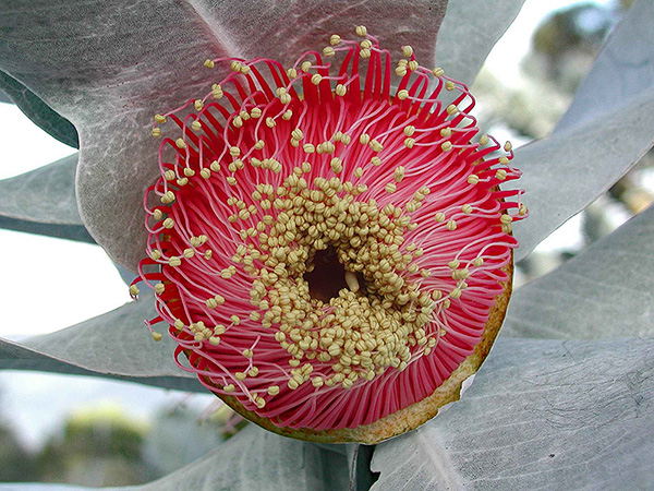 Enthralled by such unexpected flamboyance in a eucalypt, I took my sweet time studying the felty, orbicular, menthol-scented leaves before losing myself in amazement at the brilliant blossoms (up to 4 inches wide, the largest flowers in the entire, sprawling genus of 715 species), which after shucking their pointy, white-domed bud caps kick off the show looking for all the world like miniature raspberry pies until the scarlet stamens stretch out and unfurl. That’s when the golden anthers steal the scene, shimmying like sea anemones awhirl at the Folies Bergère. Even the persistent gumnuts (seed pods) are attractive.