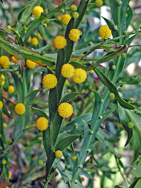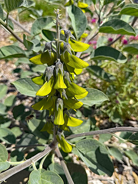 1. Pass the peas, please!—There are fistfuls of fabulous Fabaceae (pea family) plants in this spot on the globe. Pictured are the winter-blooming Acacia glaucoptera (photo taken on my 2004 trip), and a couple of perennial herbs: the heat-loving chartreuse wonder, Crotalaria cunninghamii and the swoon-inducing Swainsona formosa, commonly called Sturt’s desert pea.