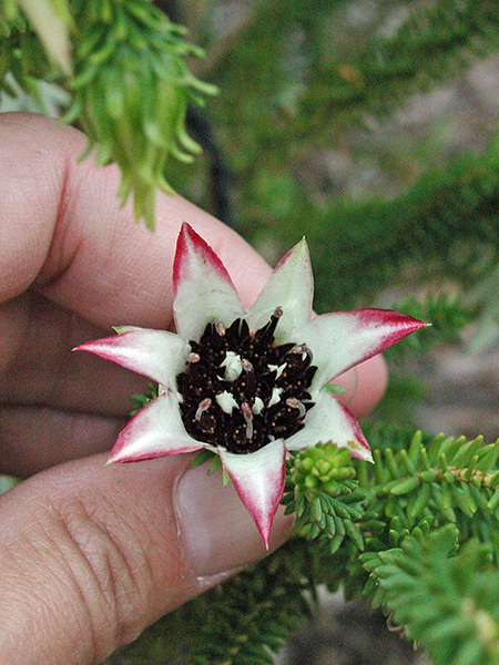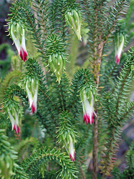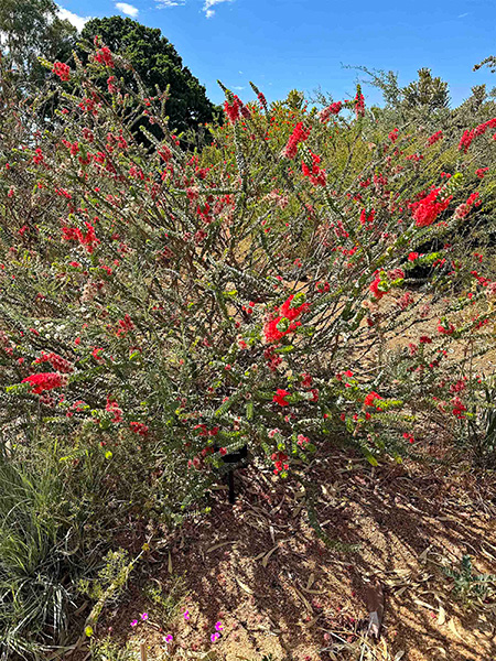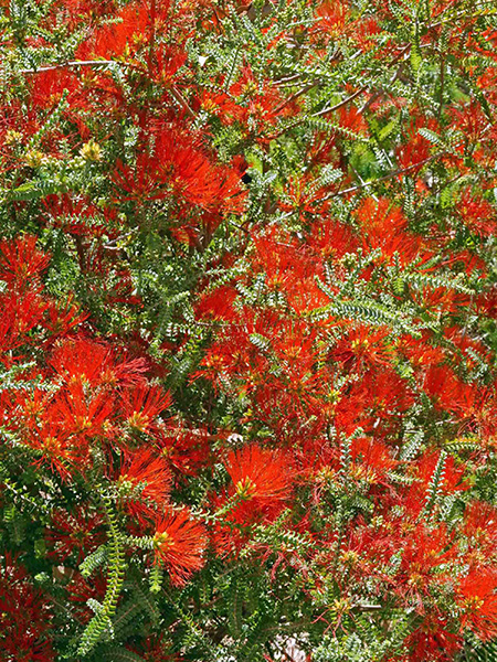 2. More marvelous myrtles—Eucalyptus may be king of the hill in the Myrtaceae (myrtle family), but there are plenty of others worthy of tribute. Pictured here are a stunning, variegated Agonis flexuosa, commonly called peppermint tree; winter-blooming Darwinia meeboldii (photo taken on my 2004 trip); the 6-foot shrub Beaufortia aestiva, sometimes called summer flame; and the large, regal shrub Verticordia grandis, or scarlet featherflower, at the tail end of its long bloom season on my recent visit.