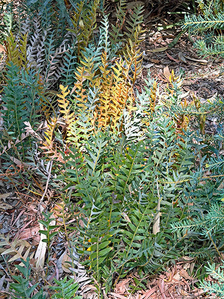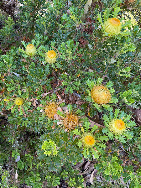 3. Bodacious & proteaceous—Australia’s most emblematic woody garden plants are surely the dynamic duo of Banksia and Grevillea in the Proteaceae (protea family). More than 60 banksia species are endemic to Western Australia, making the state the primary center of biodiversity for the genus. The W.A. Botanic Garden devotes an entire section of the garden to the genus. Who knew there were banksia groundcovers? Here I saw three species of the low-growing rascals: Banksia blechnifolia, B. petiolaris and B. repens. As for the robust, upright varieties, my favorite (at least for the moment) is the orange and cream B. burdettii. Grevilleas were not at their peak during my recent visit, although the other-worldly, tennis-ball-sized spherical blooms of Grevillea gordoniana were some of the wackiest wonders I encountered this time around.