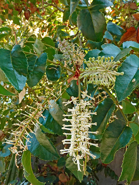 Let’s take an alphabetical look at the four genera we haven’t yet discussed. Gevuina: The only species in its genus, G. avellana (commonly called Chilean hazelnut) is oddly absent in our gardens, although Tacoma’s Point Defiance Zoo boasts a healthy, 16-year-old specimen (see photo) that sports gorgeous white bottlebrush flowers. According to chief horticulturalist Bryon Jones, it has yet to produce the hallmark edible nuts. (Sidenote: the tastiest “protean” tidbits are the nuts of the decidedly delicious Macadamia integrifolia, an Australian native we often associate with Hawaii.)