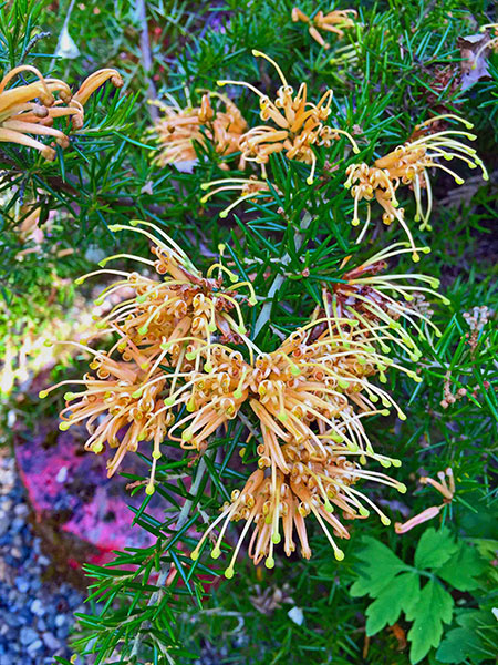 As for Grevillea, I’ve inadvertently killed about a dozen cultivars over the decades. Of all I’ve tried, only two remain, but these are fat and sassy. This prolific genus (one for every day of the year) hails almost exclusively from Australia; only a wee handful are suitable for the PNW. The most robust is G. victoriae, which grows gangbusters and pushes out spidery, rusty-orange flowers (beloved by hummingbirds) for much of the year. Giving this “royal grevillea” a run for its money is G. rosmarinifolia, a denser and more elegant shrub whose similarly spidery, cherry-pink flowers seem even more attractive to birds and bees. For 12 years I successfully grew the prostrate G. juniperina ‘Molonglo’, whose apricot-yellow flowers illuminated the spring garden. It fizzled out only because the sunny spot in which I planted it morphed over time into deep shade. More adept PNW gardeners than I report success with G. rivularis and the curious groundcover G. × gaudichaudii with its distinctly toothbrushy flowers. Both died in short order under my inept care.