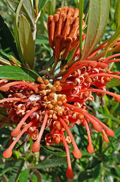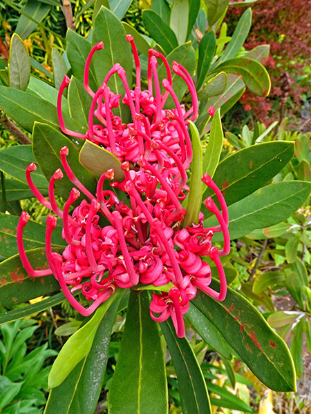 Straddling the intersection of weird, wacky and wonderful, proteaceous plants are instantly identifiable by the elaborate curlicues, pincushions or whirligigs of their complex inflorescences. The botanical family Proteaceae —which comprises only around 80 genera— was among the earliest group of flowering plants to emerge. They did so in nutrient-poor soils of the erstwhile southern-hemisphere supercontinent of Gondwanaland, which explains the family’s roughly 1600 species’ concentration in South Africa and Australia, with prominent members also found in the southern cone of South America. Closer to home, the climate of California’s Bay Area is exceptionally well suited for this family, with dazzling collections on view in the botanical gardens of UC Santa Cruz, UC Berkeley and San Francisco’s Strybing Arboretum. In our chillier region we can only grow a few of the Australian and South American Proteaceae species in the genera Embothrium (covered in the last segment of HY), Gevuina, Grevillea, Hakea, Lomatia, and Telopea.