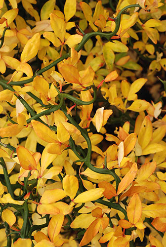 Poncirus trifoliata ‘Monstrosa’ 1 —A dwarf, this contorted version of the trifoliate orange is by far the hardiest of the whole citrus clan, reportedly surviving temperatures as low as minus 20o F. Introduced more than 100 years ago to the U.S., this form is usually marketed as ‘Flying Dragon’, a direct translation of its Japanese name, ‘Hiryu’. Its virtues are many: a fascinating structural network of twisted branches and no-nonsense, recurved thorns (which vividly exemplify its traditional use as a living fence or barrier), brilliant fall foliar color, and an abundance of dainty orange-like orbs, diminutive and downy, that yield just a modicum of ultra-tart but tasty juice. Curiously, my tree — which I’ve had nearly 20 years— drops its fruit one by one as they ripen over the course of October.